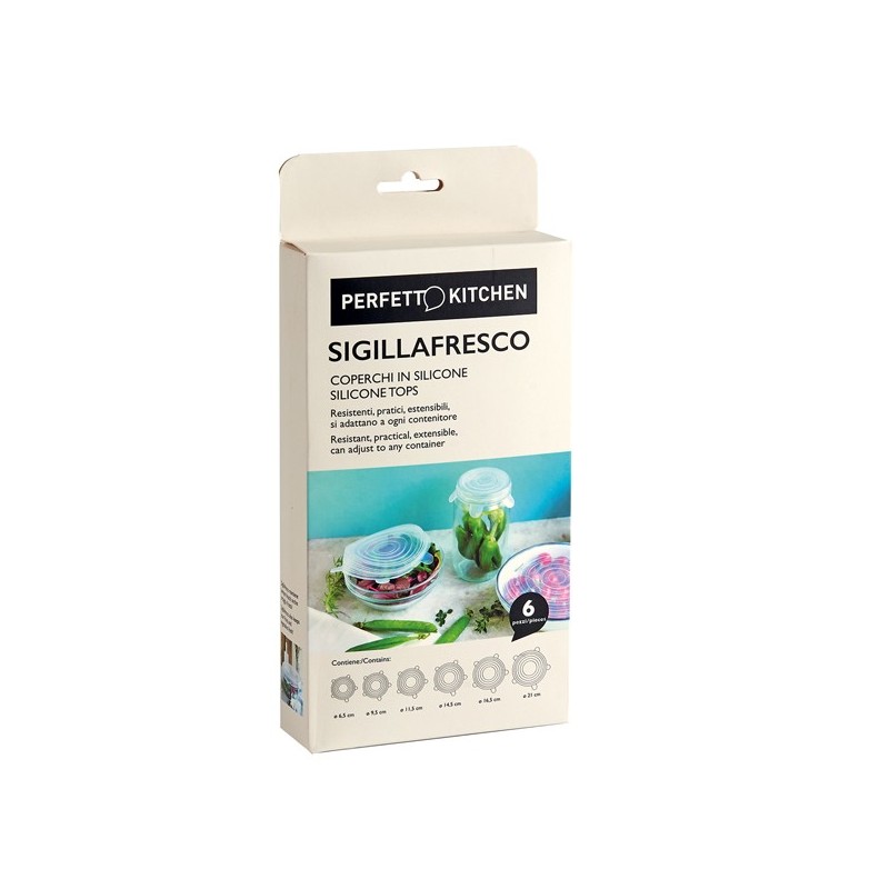 Coperchi 100% silicone resistenti, pratici, estensibili, si adattano a ogni contenitore i coperchi in silicone perfetto kitchen sono la soluzione ideale per sigillare piatti, coppe, vasi, coppette e mantenere i tuoi alimenti perfettamente freschi sia in frigo che in dispensa. provali per conservare salse, dolci, frutta, verdura, cereali, legumi sia cotti che crudi. disponibili in 6 misure, sono lavabili in lavostoviglie, riutilizzabili e impermeabili. verificare che il coperchio e il contenitore siano perfettamente asciutti prima dell’uso.
