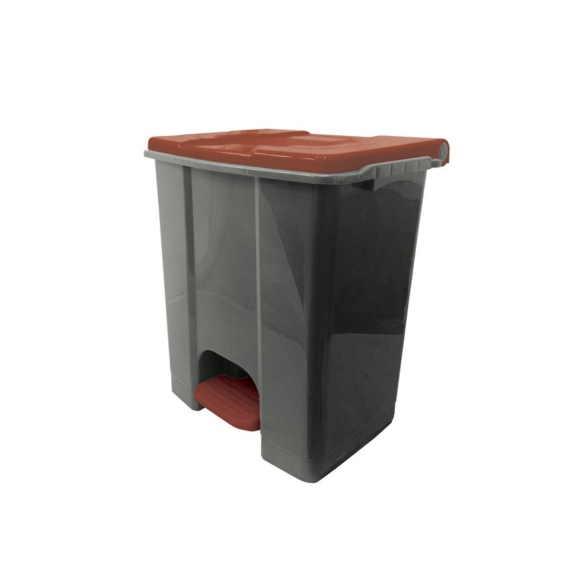 Contenitore in polipropilene plastica riciclata (minimo 70%); sistema d’apertura del coperchio in plastica; coperchi disponibili in vari colori per incentivare la raccolta differenziata; ampio pedale per utilizzo conforme al metodo HACCP; maniglia di trasporto posteriore integrata; ruote in plastica per un facile spostamento. Contenitori risultano particolarmente adeguati sia per uso interno che esterno. Dimensioni: 480 × 390 × 550 mm. Capacità: 60lt.