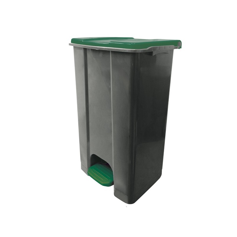 Contenitore in polipropilene plastica riciclata (minimo 70%); sistema d’apertura del coperchio in plastica; coperchi disponibili in vari colori per incentivare la raccolta differenziata; ampio pedale per utilizzo conforme al metodo HACCP; maniglia di trasporto posteriore integrata; ruote in plastica per un facile spostamento. Contenitori risultano particolarmente adeguati sia per uso interno che esterno. Dimensioni: 480 × 390 × 750 mm. Capacità: 80lt.
