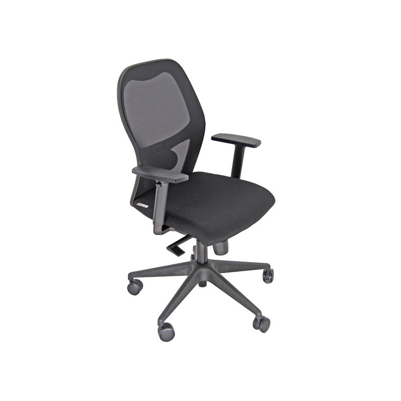 permanente - schienale con supporto lombare regolabile - sedile intercambiabile con traslatore;. Schienale in rete portante e sedile in memory foam con rivestimento in tessuto "PLUS - Ignifugo standard" 100% fibra modacrilica e reazione al fuoco classe 1. Base in nylon, braccioli regolabili. Elevazione a gas. Altezza totale: 102-113cm; Profondità totale: 68cm; Altezza seduta: 42-54cm; Larghezza sedile: 51cm; Larghezza sedile con braccioli: 66cm.