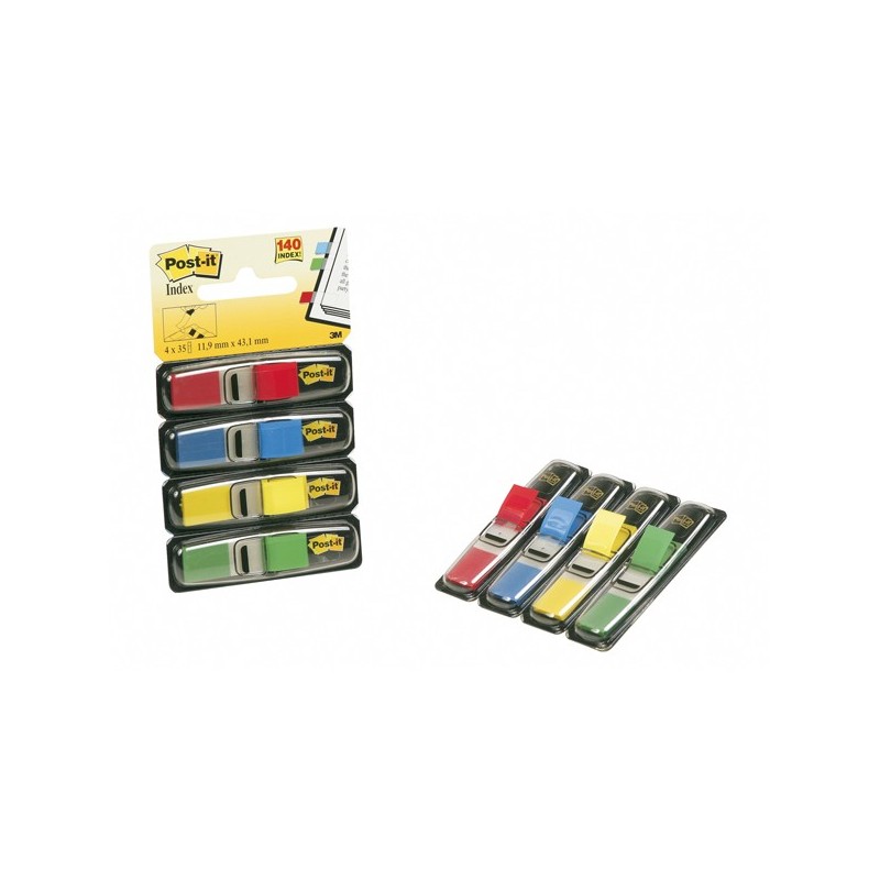 Segnapagina in formato mini, autoadesivi, scrivibili e riposizionabili per unÆeffi cace organizzazione del proprio lavoro. Disponibili in confezione da 4 colori rosso, blu, giallo e verde. Ogni confezione contiene 140 segnapagina di dimensioni 12x43,2mm.
