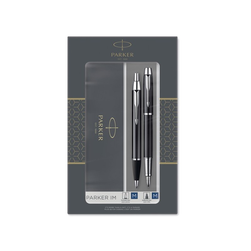 Elegante set in confezione regalo che comprende penna a sfera M IM Black CT + stilografica M IM Black. Realizzate in acciaio inox con eleganti dettagli cromati. Dotate dell'iconica clip a freccia Parker. Fornite con refill colore blu.
