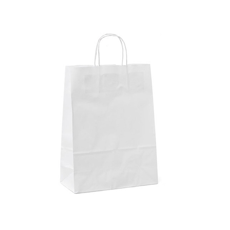 Shopper in kraft bianco, prodotte con carta riciclabile, ad elevata resistenza. Colore bianco. Dimensione 18x8x24cm.