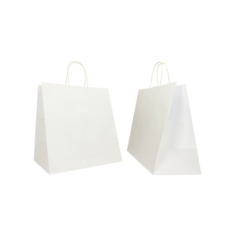 Shopper in carta kraft con maniglia in carta ritorta rinforzata. Il fondo largo rende lo shopper ideale per il trasporto di vassoi e il prodotto e particolarmente indicato per utilizzo nelle pasticcerie e pizzerie d'asporto. Carta kraft di colore bianco da 90gr. Maniglie: 2 cordini in carta ritorti.