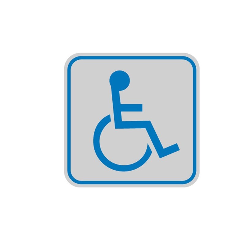 Etichette di indicazione per interni su pellicola autoadesiva colore argento opaco con pittogramma blu. Formato 82x82mm. Adatti per segnaletica in aree private.